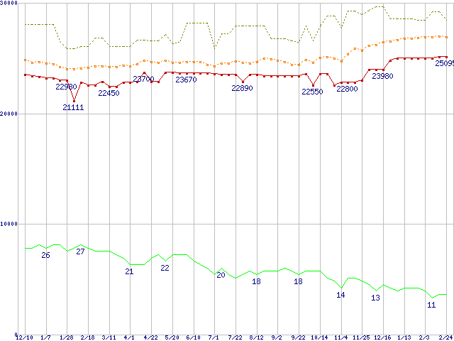 ※このグラフは過去のデータも税率5%相当に調整した税込み相当額のグラフです。 税率変更や、総額表示方式導入(2004年4月)の影響は除いています。 | | | ●凡例 | 最安値 (点線部は販売店未確認 または未調査) | 平均値 | 最高値 | ショップ数 |