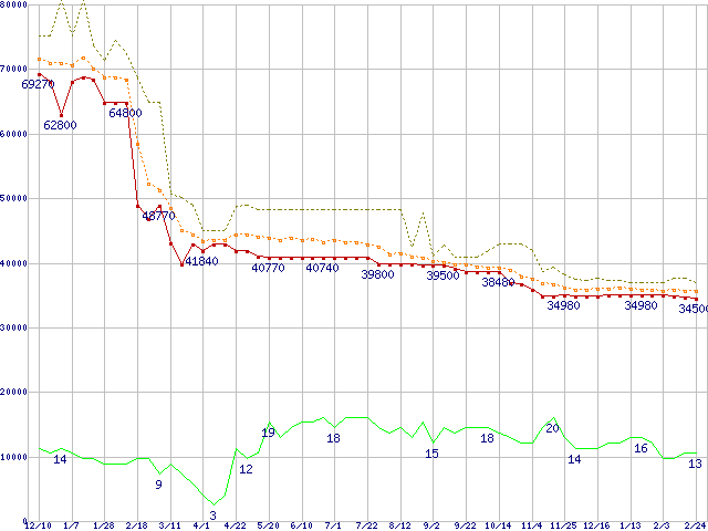 | Athlon 64 3800+ (2.4GHz,L2 512KB)の価格推移 | | | (2004年12月10日~2006年2月24日) |