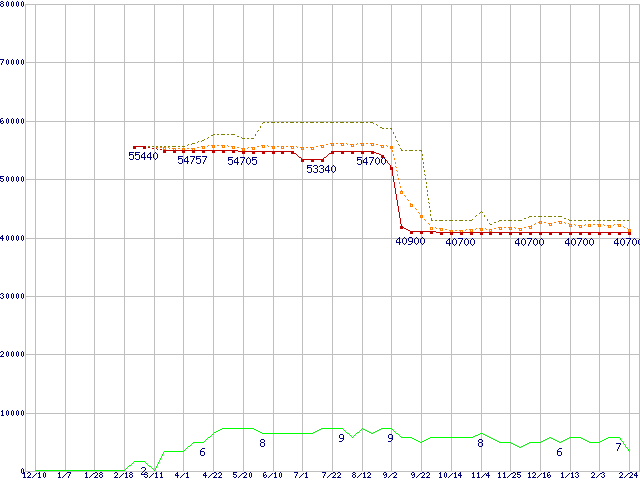 ※このグラフは過去のデータも税率5%相当に調整した税込み相当額のグラフです。 税率変更や、総額表示方式導入(2004年4月)の影響は除いています。 | | | ●凡例 | 最安値 (点線部は販売店未確認 または未調査) | 平均値 | 最高値 | ショップ数 |