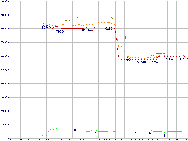 ※このグラフは過去のデータも税率5%相当に調整した税込み相当額のグラフです。 税率変更や、総額表示方式導入(2004年4月)の影響は除いています。 | | | ●凡例 | 最安値 (点線部は販売店未確認 または未調査) | 平均値 | 最高値 | ショップ数 |
