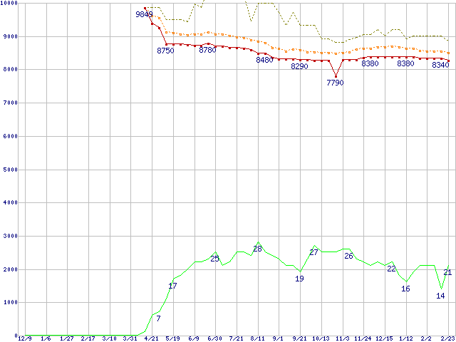 ※このグラフは過去のデータも税率5%相当に調整した税込み相当額のグラフです。 税率変更や、総額表示方式導入(2004年4月)の影響は除いています。 | | | ●凡例 | 最安値 (点線部は販売店未確認 または未調査) | 平均値 | 最高値 | ショップ数 |