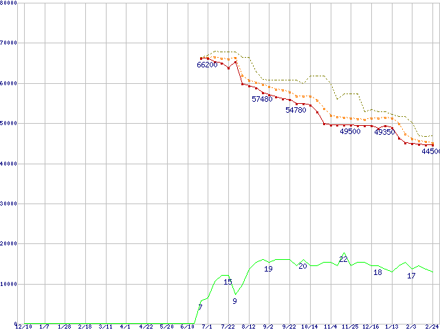 ※このグラフは過去のデータも税率5%相当に調整した税込み相当額のグラフです。 税率変更や、総額表示方式導入(2004年4月)の影響は除いています。 | | | ●凡例 | 最安値 (点線部は販売店未確認 または未調査) | 平均値 | 最高値 | ショップ数 |