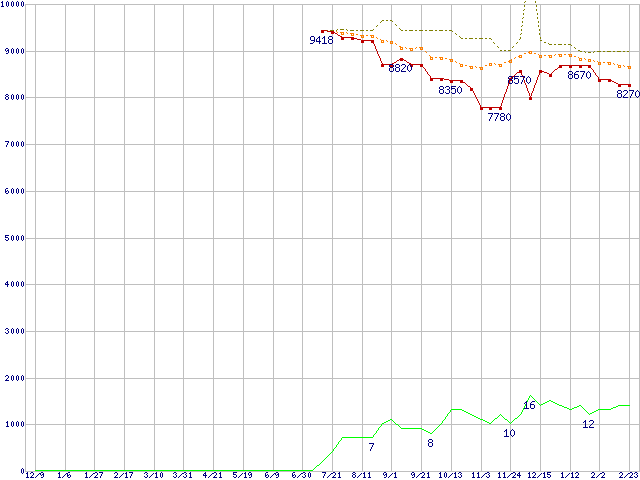 ※このグラフは過去のデータも税率5%相当に調整した税込み相当額のグラフです。 税率変更や、総額表示方式導入(2004年4月)の影響は除いています。 | | | ●凡例 | 最安値 (点線部は販売店未確認 または未調査) | 平均値 | 最高値 | ショップ数 |