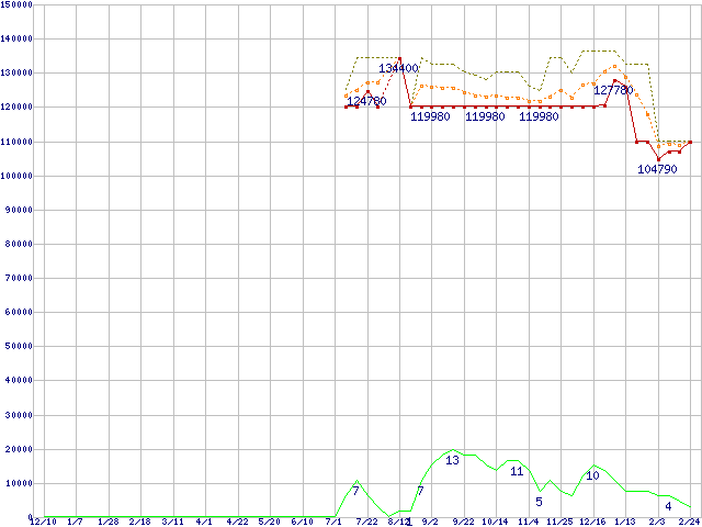 ※このグラフは過去のデータも税率5%相当に調整した税込み相当額のグラフです。 税率変更や、総額表示方式導入(2004年4月)の影響は除いています。 | | | ●凡例 | 最安値 (点線部は販売店未確認 または未調査) | 平均値 | 最高値 | ショップ数 |