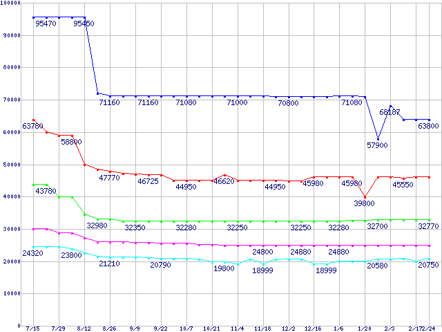 | LGA 775 (FSB 800MHz,L2 2MB,Hyper-Threading,EM64T対応)の最安値推移 | | | (2005年7月15日~2006年2月24日) |