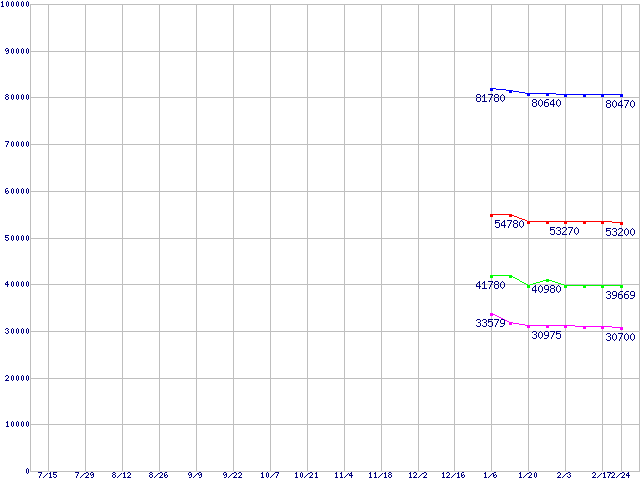 | LGA 775 (FSB 800MHz,L2 2MB×2,Dual Core,EM64T・VT対応)の最安値推移 | | | (2005年7月15日~2006年2月24日) |