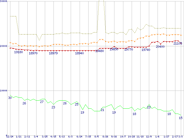 ※このグラフは過去のデータも税率5%相当に調整した税込み相当額のグラフです。 税率変更や、総額表示方式導入(2004年4月)の影響は除いています。 | | | ●凡例 | 最安値 (点線部は販売店未確認 または未調査) | 平均値 | 最高値 | ショップ数 |