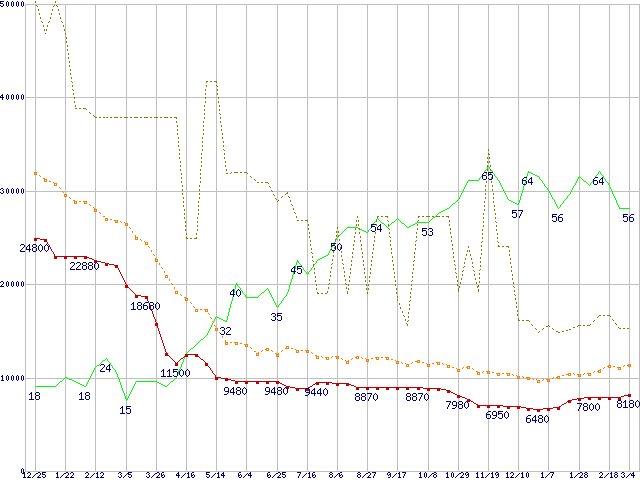 ※このグラフは過去のデータも税率5%相当に調整した税込み相当額のグラフです。 税率変更や、総額表示方式導入(2004年4月)の影響は除いています。 | | | ●凡例 | 最安値 (点線部は販売店未確認 または未調査) | 平均値 | 最高値 | ショップ数 |