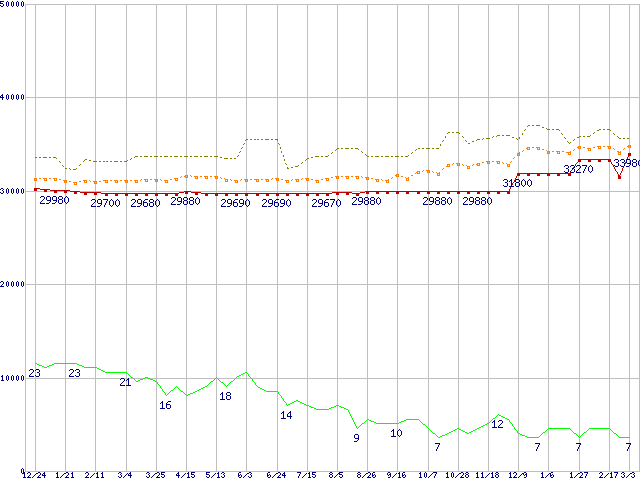 ※このグラフは過去のデータも税率5%相当に調整した税込み相当額のグラフです。 税率変更や、総額表示方式導入(2004年4月)の影響は除いています。 | | | ●凡例 | 最安値 (点線部は販売店未確認 または未調査) | 平均値 | 最高値 | ショップ数 |