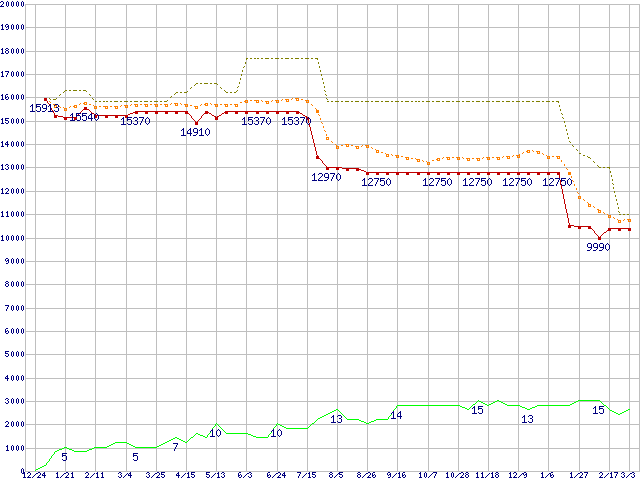 ※このグラフは過去のデータも税率5%相当に調整した税込み相当額のグラフです。 税率変更や、総額表示方式導入(2004年4月)の影響は除いています。 | | | ●凡例 | 最安値 (点線部は販売店未確認 または未調査) | 平均値 | 最高値 | ショップ数 |