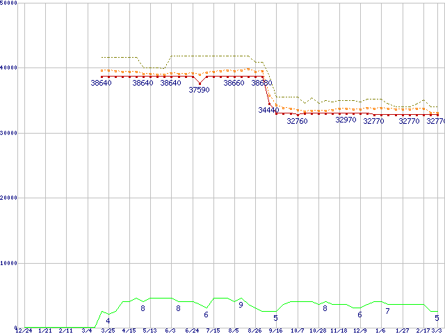 ※このグラフは過去のデータも税率5%相当に調整した税込み相当額のグラフです。 税率変更や、総額表示方式導入(2004年4月)の影響は除いています。 | | | ●凡例 | 最安値 (点線部は販売店未確認 または未調査) | 平均値 | 最高値 | ショップ数 |