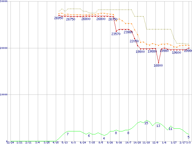 ※このグラフは過去のデータも税率5%相当に調整した税込み相当額のグラフです。 税率変更や、総額表示方式導入(2004年4月)の影響は除いています。 | | | ●凡例 | 最安値 (点線部は販売店未確認 または未調査) | 平均値 | 最高値 | ショップ数 |