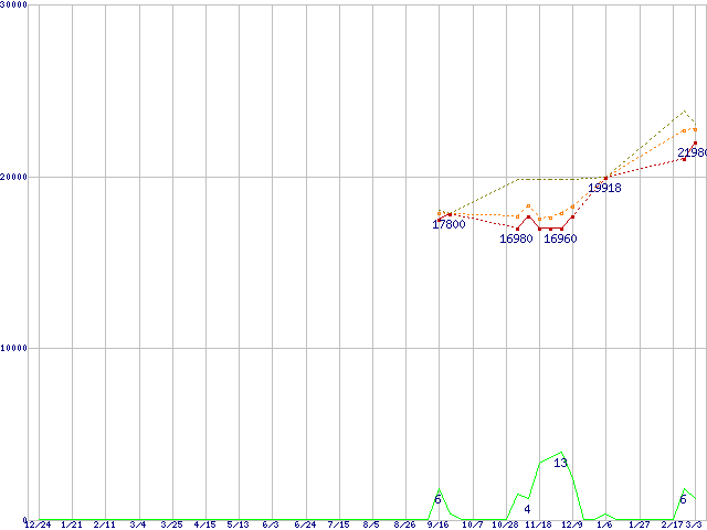 ※このグラフは過去のデータも税率5%相当に調整した税込み相当額のグラフです。 税率変更や、総額表示方式導入(2004年4月)の影響は除いています。 | | | ●凡例 | 最安値 (点線部は販売店未確認 または未調査) | 平均値 | 最高値 | ショップ数 |