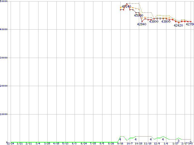 ※このグラフは過去のデータも税率5%相当に調整した税込み相当額のグラフです。 税率変更や、総額表示方式導入(2004年4月)の影響は除いています。 | | | ●凡例 | 最安値 (点線部は販売店未確認 または未調査) | 平均値 | 最高値 | ショップ数 |