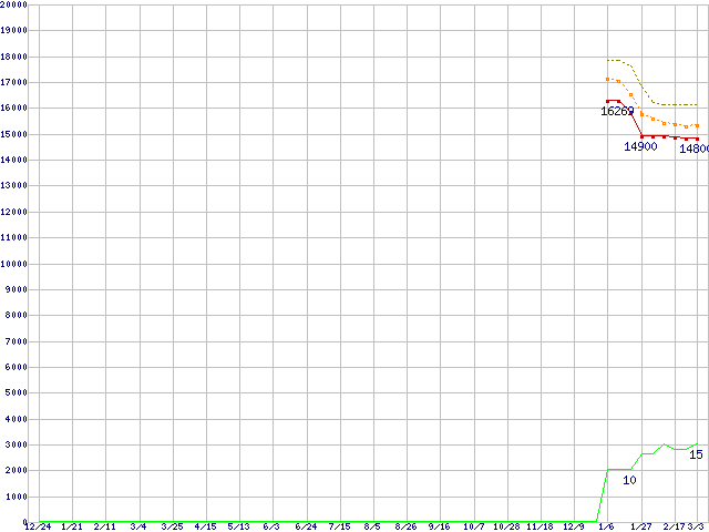※このグラフは過去のデータも税率5%相当に調整した税込み相当額のグラフです。 税率変更や、総額表示方式導入(2004年4月)の影響は除いています。 | | | ●凡例 | 最安値 (点線部は販売店未確認 または未調査) | 平均値 | 最高値 | ショップ数 |