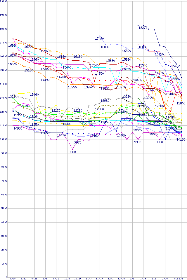 | HDD主要製品(最安値1万円~1万5千円未満)の最安値推移 | | | (2005年7月28日~2006年3月9日) |