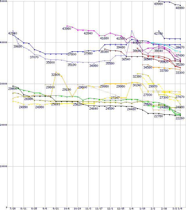 | HDD主要製品(最安値2万円以上)の最安値推移 | | | (2005年7月28日~2006年3月9日) |