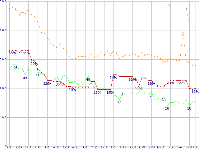 ※このグラフは過去のデータも税率5%相当に調整した税込み相当額のグラフです。 税率変更や、総額表示方式導入(2004年4月)の影響は除いています。 | | | ●凡例 | 最安値 (点線部は販売店未確認 または未調査) | 平均値 | 最高値 | ショップ数 |