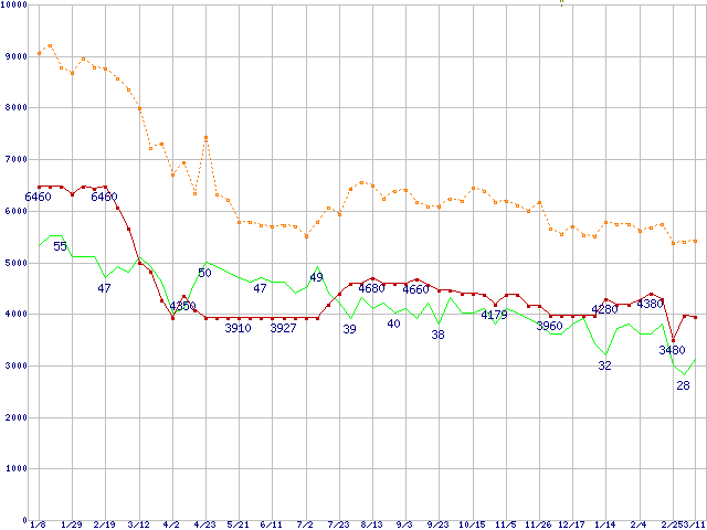 ※このグラフは過去のデータも税率5%相当に調整した税込み相当額のグラフです。 税率変更や、総額表示方式導入(2004年4月)の影響は除いています。 | | | ●凡例 | 最安値 (点線部は販売店未確認 または未調査) | 平均値 | 最高値 | ショップ数 |