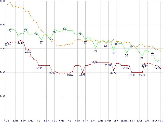 ※このグラフは過去のデータも税率5%相当に調整した税込み相当額のグラフです。 税率変更や、総額表示方式導入(2004年4月)の影響は除いています。 | | | ●凡例 | 最安値 (点線部は販売店未確認 または未調査) | 平均値 | 最高値 | ショップ数 |