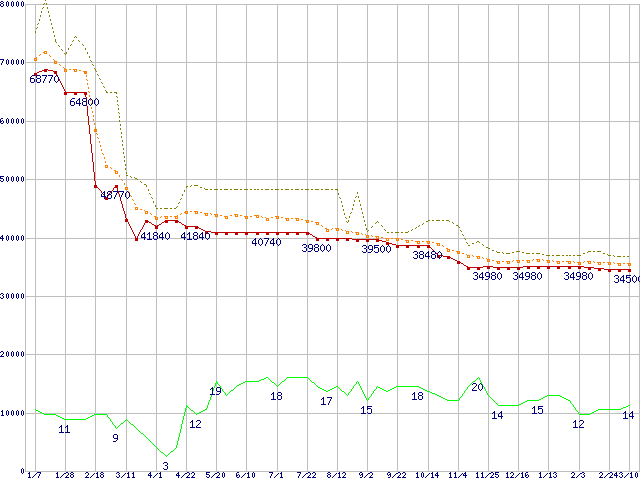 ※このグラフは過去のデータも税率5%相当に調整した税込み相当額のグラフです。 税率変更や、総額表示方式導入(2004年4月)の影響は除いています。 | | | ●凡例 | 最安値 (点線部は販売店未確認 または未調査) | 平均値 | 最高値 | ショップ数 |