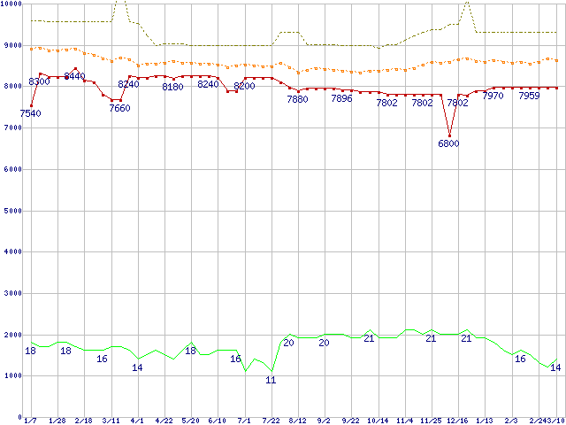 ※このグラフは過去のデータも税率5%相当に調整した税込み相当額のグラフです。 税率変更や、総額表示方式導入(2004年4月)の影響は除いています。 | | | ●凡例 | 最安値 (点線部は販売店未確認 または未調査) | 平均値 | 最高値 | ショップ数 |