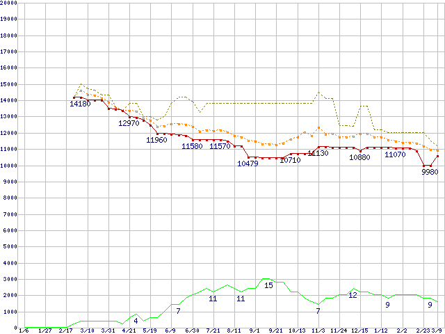 ※このグラフは過去のデータも税率5%相当に調整した税込み相当額のグラフです。 税率変更や、総額表示方式導入(2004年4月)の影響は除いています。 | | | ●凡例 | 最安値 (点線部は販売店未確認 または未調査) | 平均値 | 最高値 | ショップ数 |