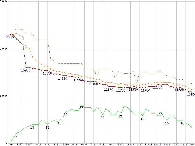 ※このグラフは過去のデータも税率5%相当に調整した税込み相当額のグラフです。 税率変更や、総額表示方式導入(2004年4月)の影響は除いています。 | | | ●凡例 | 最安値 (点線部は販売店未確認 または未調査) | 平均値 | 最高値 | ショップ数 |