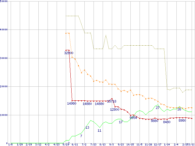 ※このグラフは過去のデータも税率5%相当に調整した税込み相当額のグラフです。 税率変更や、総額表示方式導入(2004年4月)の影響は除いています。 | | | ●凡例 | 最安値 (点線部は販売店未確認 または未調査) | 平均値 | 最高値 | ショップ数 |