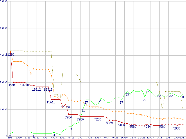 ※このグラフは過去のデータも税率5%相当に調整した税込み相当額のグラフです。 税率変更や、総額表示方式導入(2004年4月)の影響は除いています。 | | | ●凡例 | 最安値 (点線部は販売店未確認 または未調査) | 平均値 | 最高値 | ショップ数 |