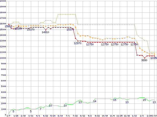 ※このグラフは過去のデータも税率5%相当に調整した税込み相当額のグラフです。 税率変更や、総額表示方式導入(2004年4月)の影響は除いています。 | | | ●凡例 | 最安値 (点線部は販売店未確認 または未調査) | 平均値 | 最高値 | ショップ数 |