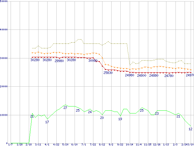 ※このグラフは過去のデータも税率5%相当に調整した税込み相当額のグラフです。 税率変更や、総額表示方式導入(2004年4月)の影響は除いています。 | | | ●凡例 | 最安値 (点線部は販売店未確認 または未調査) | 平均値 | 最高値 | ショップ数 |