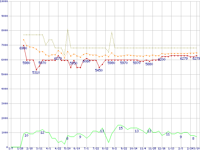 ※このグラフは過去のデータも税率5%相当に調整した税込み相当額のグラフです。 税率変更や、総額表示方式導入(2004年4月)の影響は除いています。 | | | ●凡例 | 最安値 (点線部は販売店未確認 または未調査) | 平均値 | 最高値 | ショップ数 |