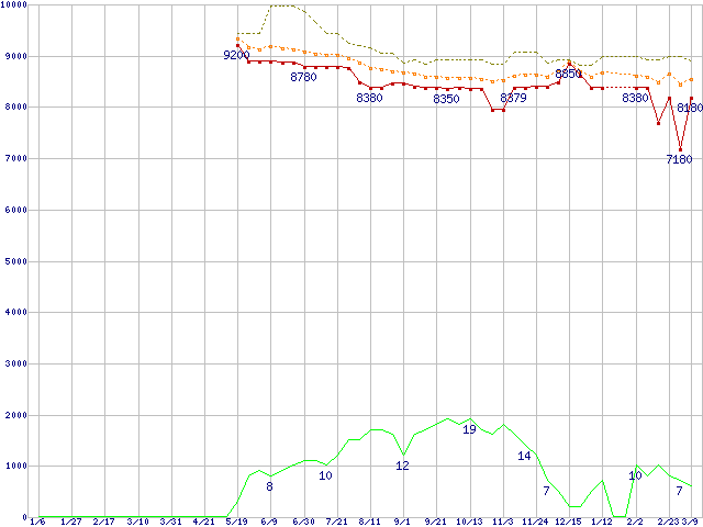 ※このグラフは過去のデータも税率5%相当に調整した税込み相当額のグラフです。 税率変更や、総額表示方式導入(2004年4月)の影響は除いています。 | | | ●凡例 | 最安値 (点線部は販売店未確認 または未調査) | 平均値 | 最高値 | ショップ数 |