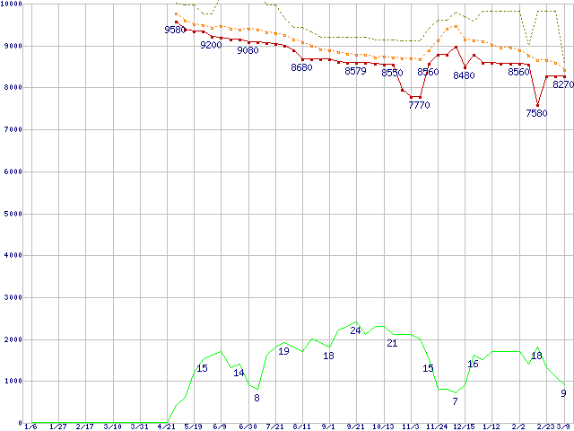 ※このグラフは過去のデータも税率5%相当に調整した税込み相当額のグラフです。 税率変更や、総額表示方式導入(2004年4月)の影響は除いています。 | | | ●凡例 | 最安値 (点線部は販売店未確認 または未調査) | 平均値 | 最高値 | ショップ数 |