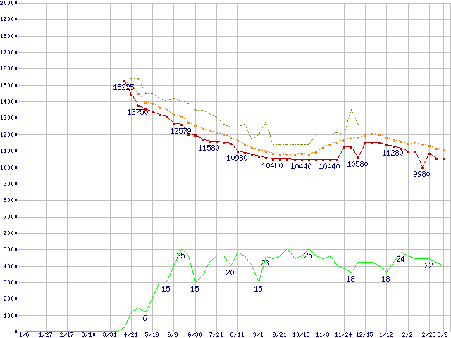 ※このグラフは過去のデータも税率5%相当に調整した税込み相当額のグラフです。 税率変更や、総額表示方式導入(2004年4月)の影響は除いています。 | | | ●凡例 | 最安値 (点線部は販売店未確認 または未調査) | 平均値 | 最高値 | ショップ数 |