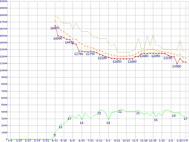 ※このグラフは過去のデータも税率5%相当に調整した税込み相当額のグラフです。 税率変更や、総額表示方式導入(2004年4月)の影響は除いています。 | | | ●凡例 | 最安値 (点線部は販売店未確認 または未調査) | 平均値 | 最高値 | ショップ数 |