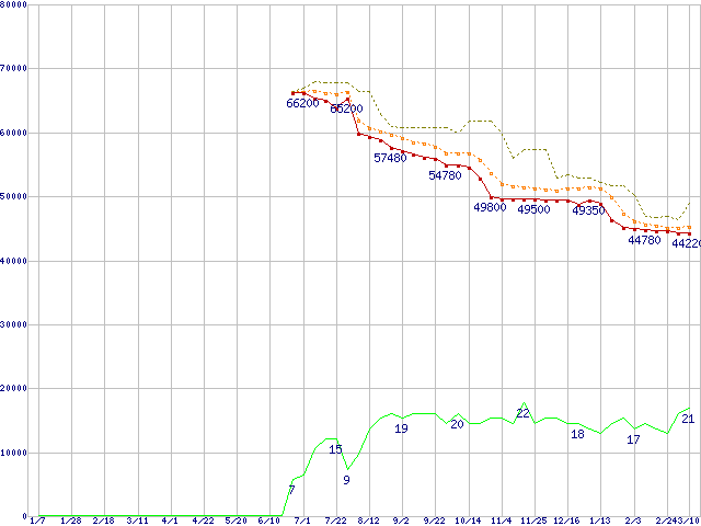 ※このグラフは過去のデータも税率5%相当に調整した税込み相当額のグラフです。 税率変更や、総額表示方式導入(2004年4月)の影響は除いています。 | | | ●凡例 | 最安値 (点線部は販売店未確認 または未調査) | 平均値 | 最高値 | ショップ数 |