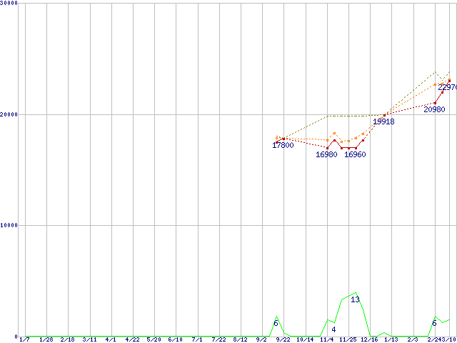 ※このグラフは過去のデータも税率5%相当に調整した税込み相当額のグラフです。 税率変更や、総額表示方式導入(2004年4月)の影響は除いています。 | | | ●凡例 | 最安値 (点線部は販売店未確認 または未調査) | 平均値 | 最高値 | ショップ数 |