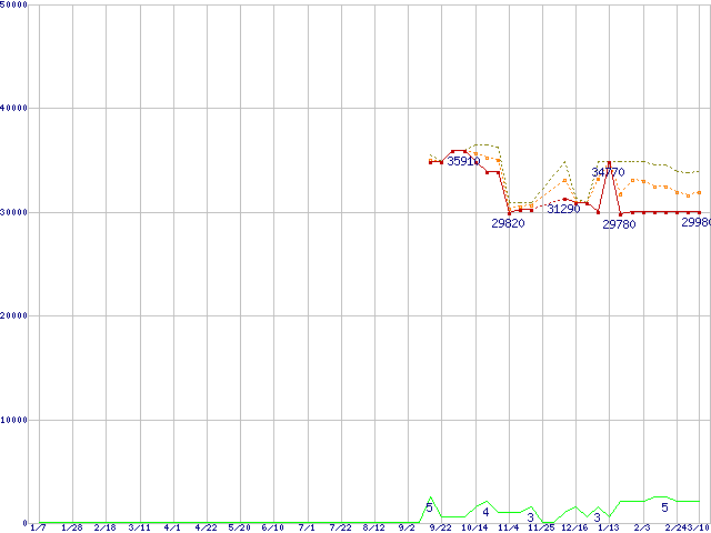 ※このグラフは過去のデータも税率5%相当に調整した税込み相当額のグラフです。 税率変更や、総額表示方式導入(2004年4月)の影響は除いています。 | | | ●凡例 | 最安値 (点線部は販売店未確認 または未調査) | 平均値 | 最高値 | ショップ数 |