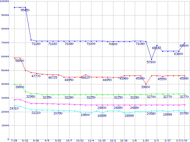 | LGA 775 (FSB 800MHz,L2 2MB,Hyper-Threading,EM64T対応)の最安値推移 | | | (2005年7月29日~2006年3月10日) |