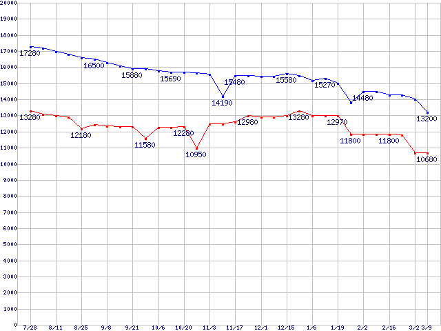 | MaXLine III (7200rpm,16MB,Serial ATA II Phase1,RoHS指令準拠)の最安値推移 | | | (2005年7月28日~2006年3月9日) |