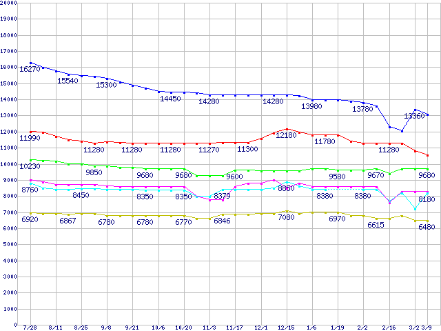 | DiamondMax 10 (7200rpm,Serial ATA II Phase1,RoHS指令準拠)の最安値推移 | | | (2005年7月28日~2006年3月9日) |