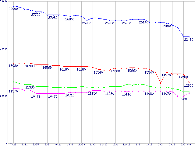 | Barracuda 7200.8 SATA (7200rpm,Serial ATA,NCQ,8MB,133GB/Platter)の最安値推移 | | | (2005年7月28日~2006年3月9日) |
