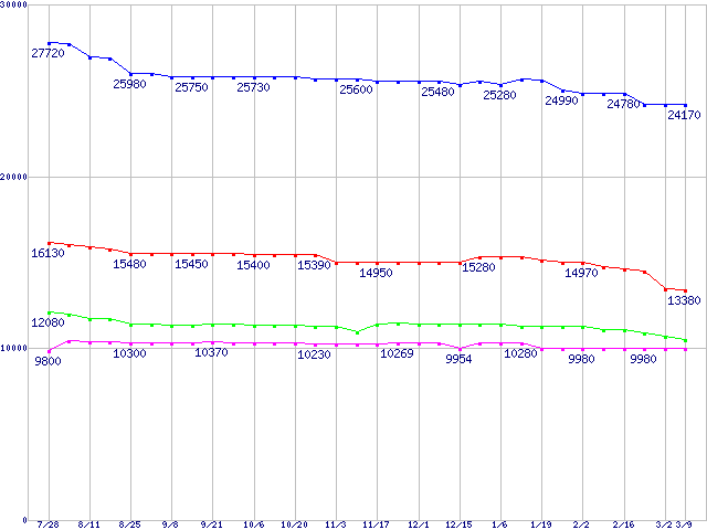 | Barracuda 7200.8 (7200rpm,Ultra ATA/100,8MB,133GB/Platter)の最安値推移 | | | (2005年7月28日~2006年3月9日) |