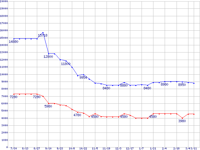PC2-5300(DDR2-667) DDR2 SDRAM DIMMの最安値推移