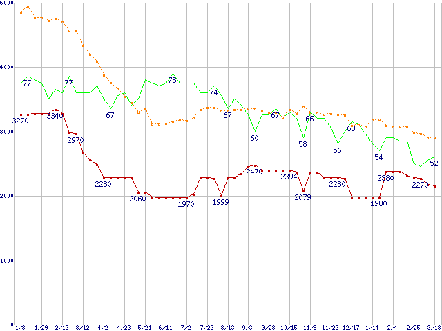 ※このグラフは過去のデータも税率5%相当に調整した税込み相当額のグラフです。 税率変更や、総額表示方式導入(2004年4月)の影響は除いています。 | | | ●凡例 | 最安値 (点線部は販売店未確認 または未調査) | 平均値 | 最高値 | ショップ数 |