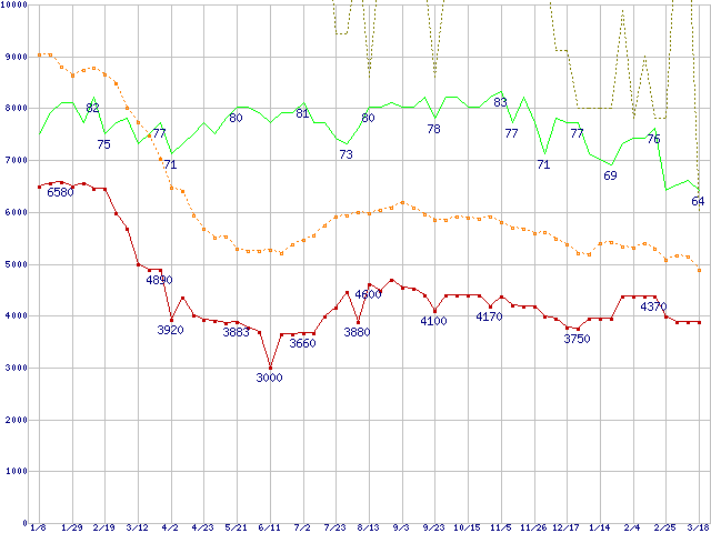 ※このグラフは過去のデータも税率5%相当に調整した税込み相当額のグラフです。 税率変更や、総額表示方式導入(2004年4月)の影響は除いています。 | | | ●凡例 | 最安値 (点線部は販売店未確認 または未調査) | 平均値 | 最高値 | ショップ数 |