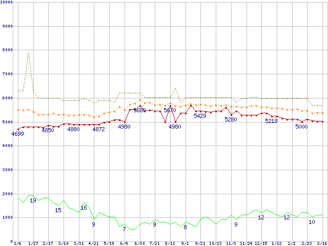 ※このグラフは過去のデータも税率5%相当に調整した税込み相当額のグラフです。 税率変更や、総額表示方式導入(2004年4月)の影響は除いています。 | | | ●凡例 | 最安値 (点線部は販売店未確認 または未調査) | 平均値 | 最高値 | ショップ数 |