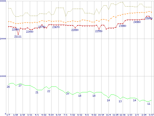 ※このグラフは過去のデータも税率5%相当に調整した税込み相当額のグラフです。 税率変更や、総額表示方式導入(2004年4月)の影響は除いています。 | | | ●凡例 | 最安値 (点線部は販売店未確認 または未調査) | 平均値 | 最高値 | ショップ数 |